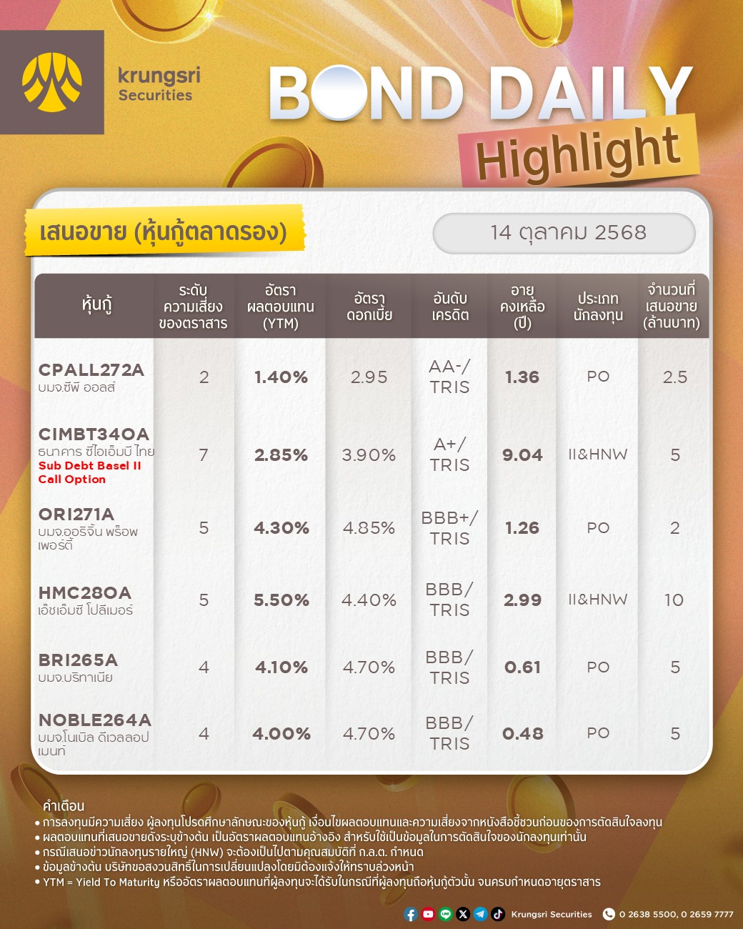 14/10/68 | หุ้นกู้/พันธบัตร | Bond Daily Highlight 14/10/2025 | |