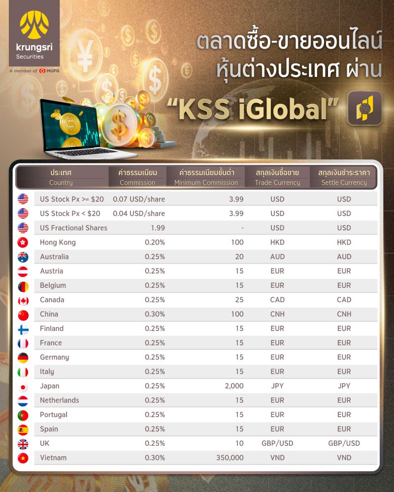 - Krungsri Securities iGlobal คือ บริการการลงทุนหลักทรัพย์ต่างประเทศ 24 ชม. จากบริษัทหลักทรัพย์ กรุงศรี จำกัด (มหาชน) ที่ช่วยให้ลูกค้าสามารถซื้อขายหลักทรัพย์ต่างประเทศได้ด้วยตนเองผ่านระบบออนไลน์