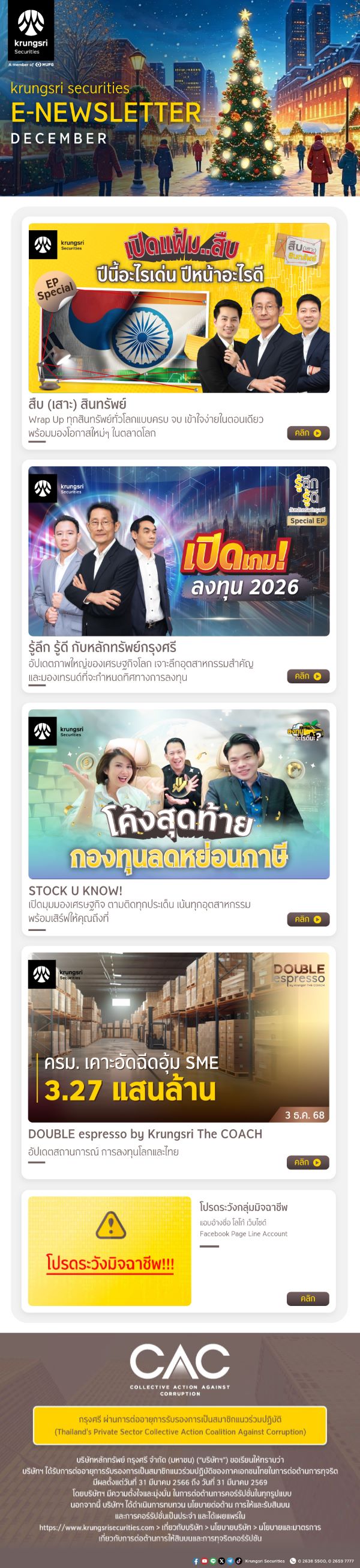 อีเมลฉบับนี้ถูกจัดทำขึ้นเพื่อลูกค้าบริษัทหลักทรัพย์ กรุงศรี จำกัด (มหาชน) หากท่านไม่ประสงค์ที่จะรับข้อมูลข่าวสารของบริษัทฯ ผ่านทางอีเมล หรือต้องการแจ้งเปลี่ยนแปลงอีเมล และข้อมูลอื่นๆ ของท่าน