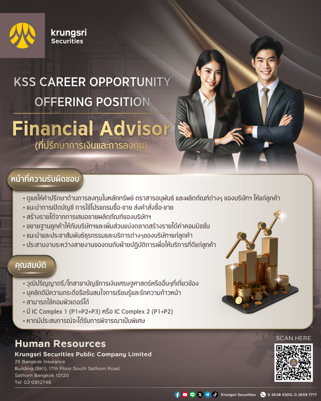 • มีประสบการณ์เป็น Investment Consultant / ผู้แนะนำการลงทุน อย่างน้อย 5–7 ปี และมีประสบการณ์บริหารทีม