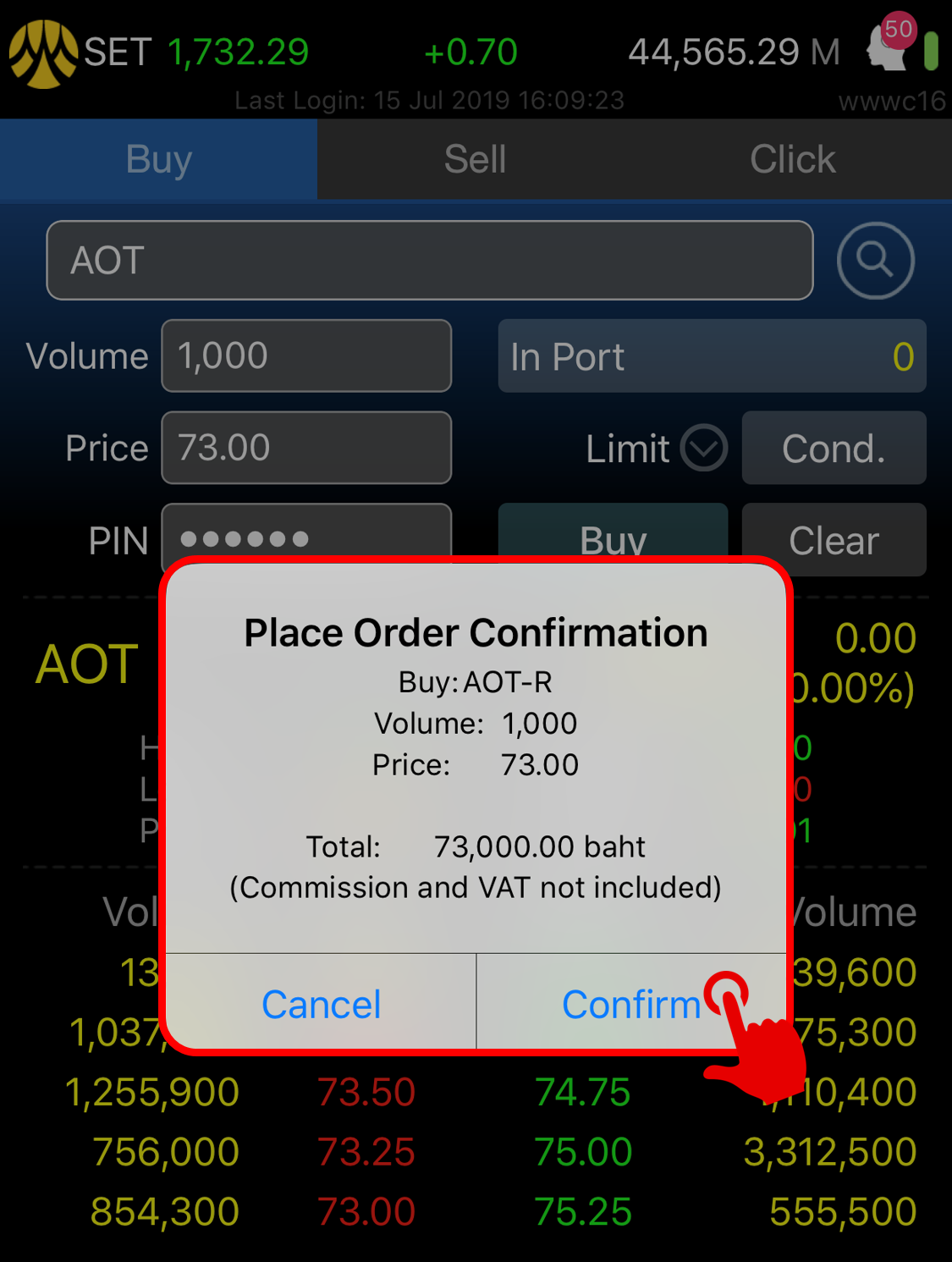 6. ระบบขึ้นข้อความแจ้งเตือนให้ตรวจสอบรายการ หากข้อมูลถูกต้องให้กด Confirm เพื่อยืนยันการซื้อขาย