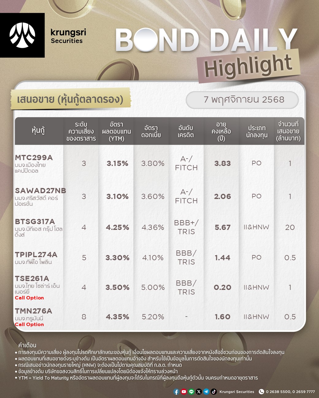 | 07/11/68 | หุ้นกู้/พันธบัตร | Bond Daily Highlight 7/11/2025 | |